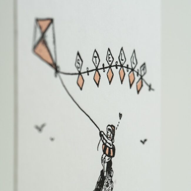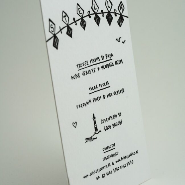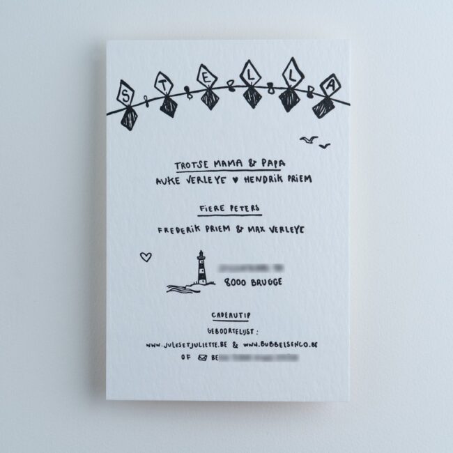Voor de geboorte van hun dochtertje Stella lieten Auke en Hendrik een illustratief geboortekaartje ontwerpen door Penelope. Dit werd voor hen gedrukt door het Letterkabinet in letterpress.